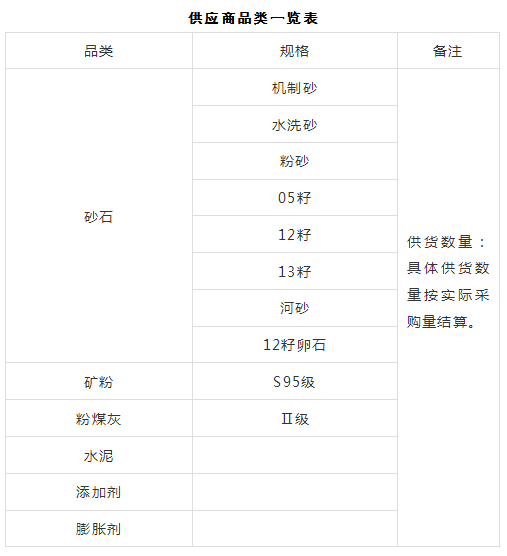 本次征集活動(dòng)為2025年度第一次原材料供應商的征集,征集供應商品類(lèi)為:砂石、水泥、粉煤灰、礦粉、膨脹劑、減水劑、外加劑等,現每年總需求約200萬(wàn)噸。